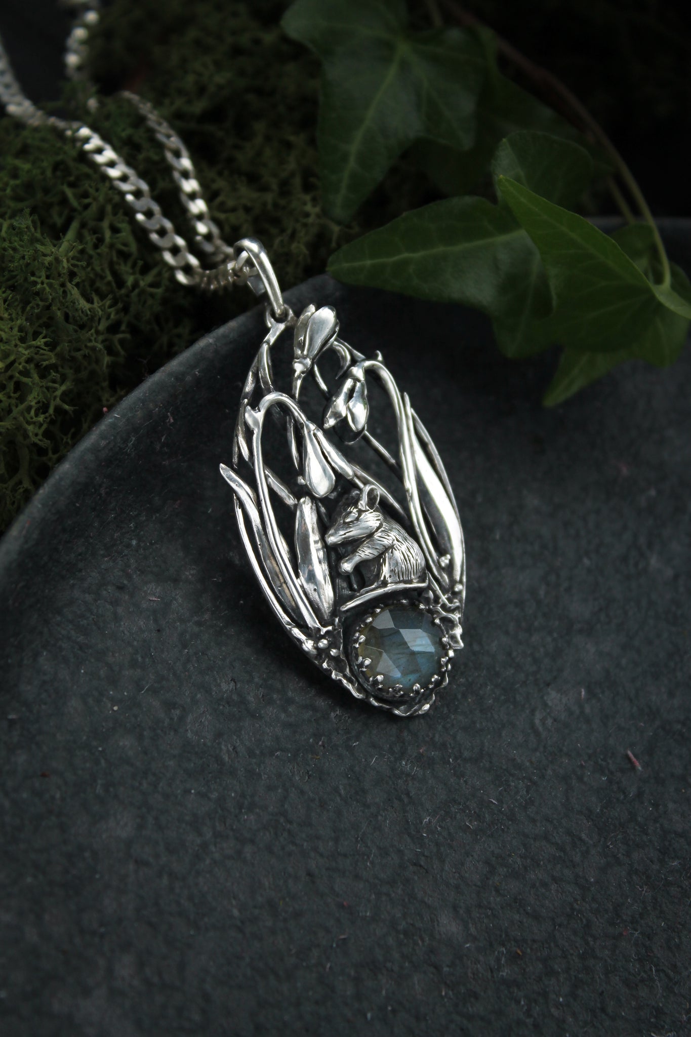 Mouse and Snowdrop necklace Spring flower pendant Blooming silver flowers