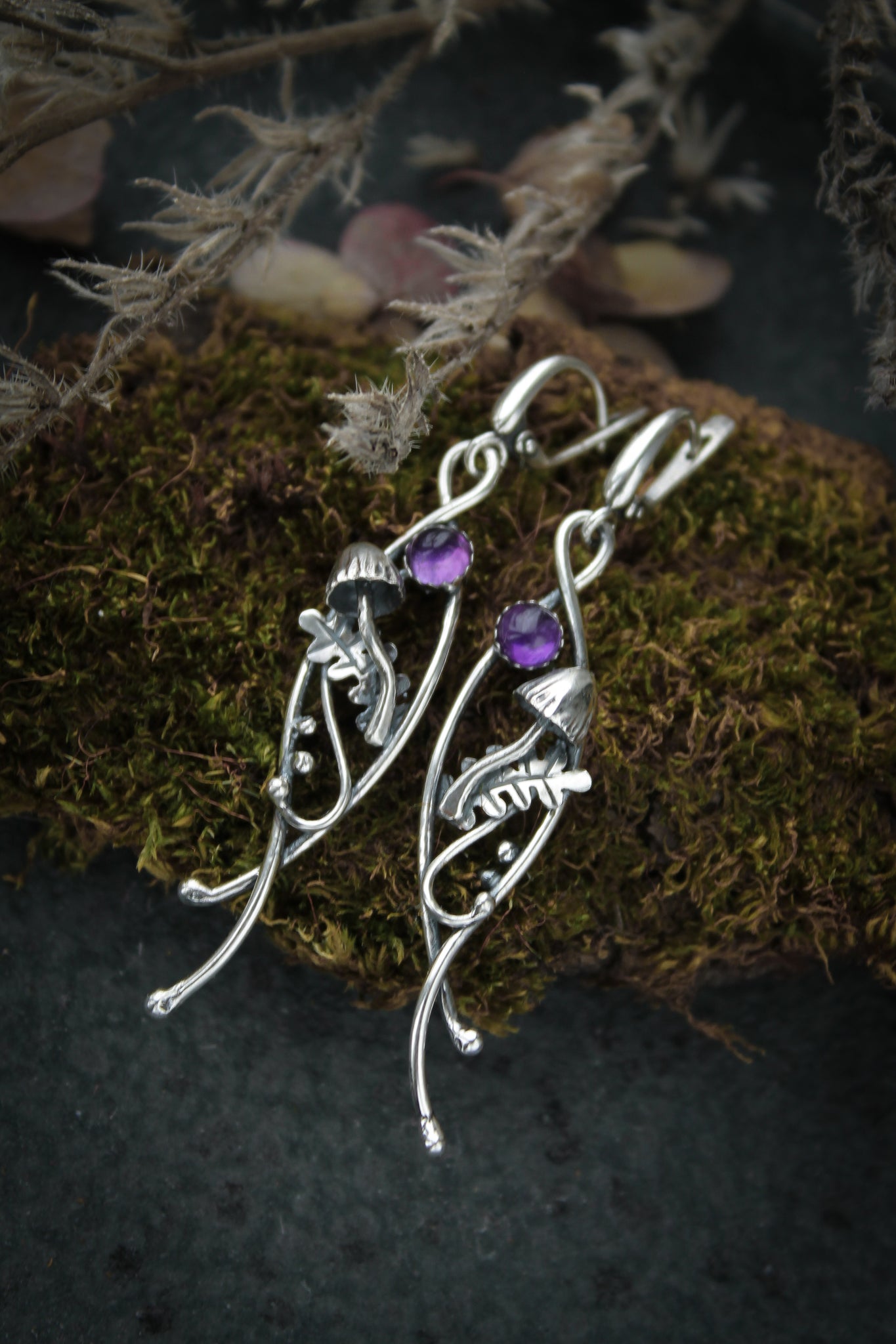 Absolutely wonderful and unique silver earrings with mushrooms and leaves. I made these botanical earrings with Labradorite. But you can order them with different gemstones.